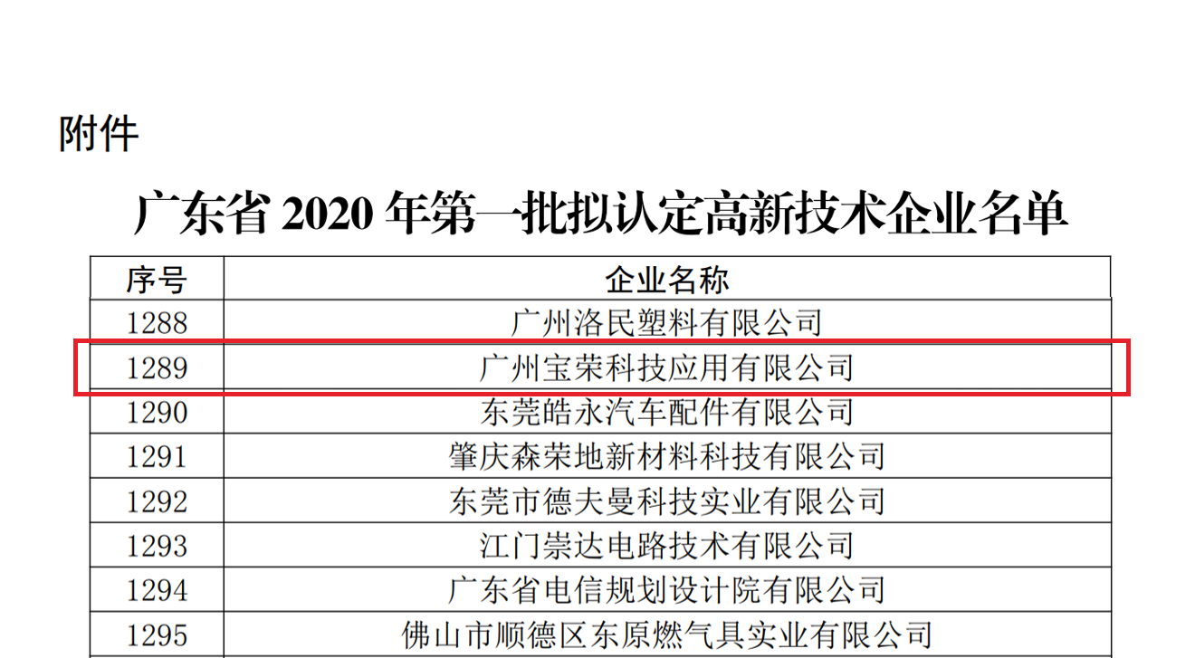 公司新聞2020年12月1日,經(jīng)全國(guó)高新技術(shù)企業(yè)認(rèn)定管理工作領(lǐng)導(dǎo)小組辦公室審核同意,根據(jù)《高新技術(shù)企業(yè)認(rèn)定管理辦法》(國(guó)科發(fā)火〔2016〕32號(hào))和《高新技術(shù)企業(yè)認(rèn)定管理工作指引》(國(guó)科發(fā)火〔2016〕195號(hào))有關(guān)規(guī)定,廣東省2020年第一批3507家企業(yè)擬認(rèn)定高新技術(shù)企業(yè)名單予以公示,廣州寶榮科技應(yīng)用有限公司再次獲得高新技術(shù)企業(yè)的認(rèn)定!